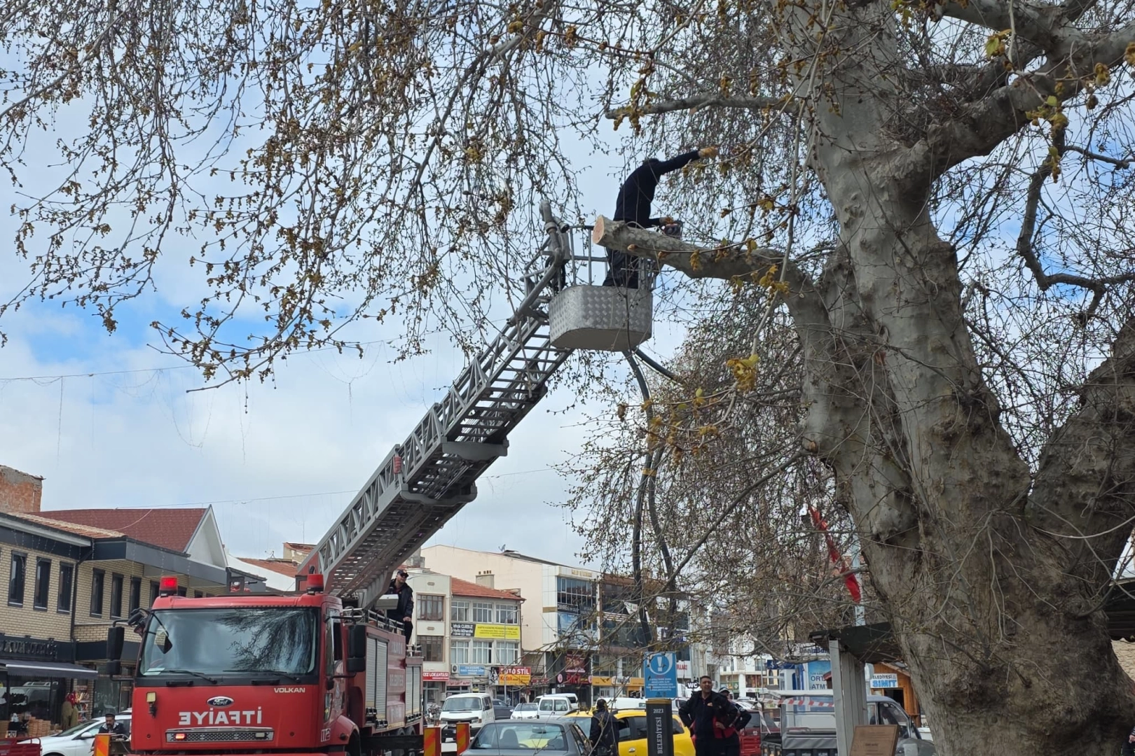 Bolvadin çarşı merkezinde konumlanan ve ilçenin sembolleri arasında bulunan tarihi çınar ağacında budama işlemleri gerçekleştiriliyor.